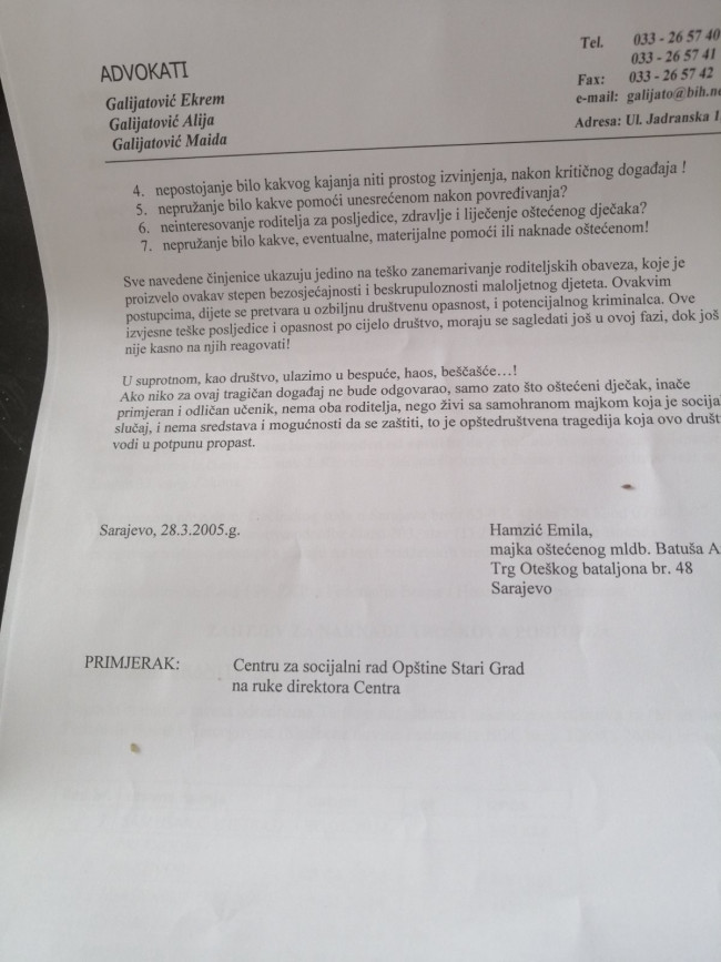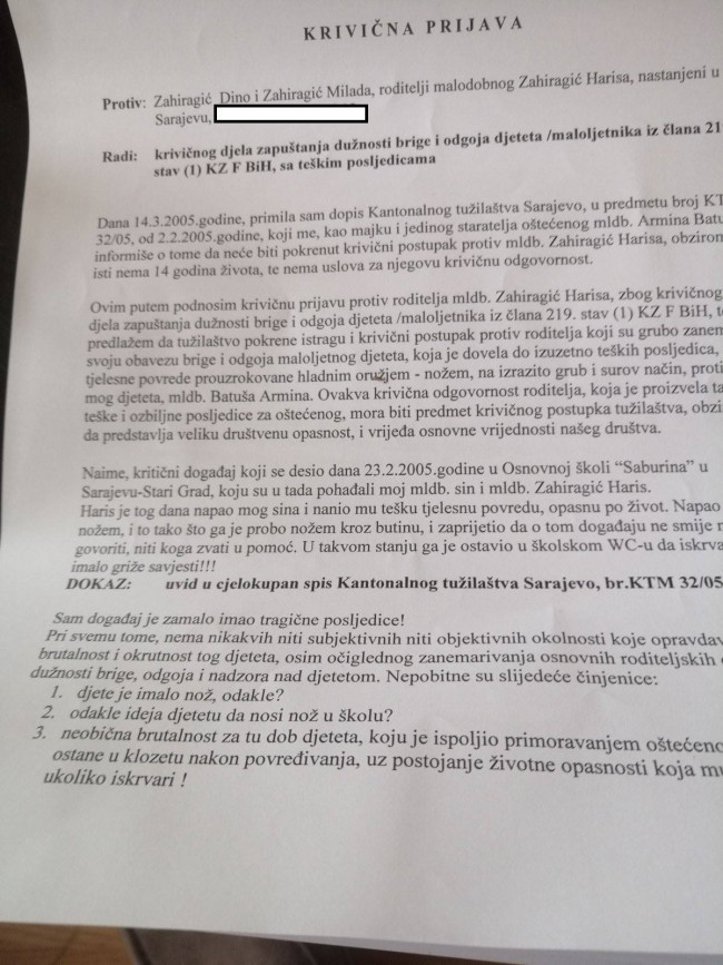 Radi se o krivičnoj prijavi iz marta 2005. godine, podnesenoj Kantonalnom tužilaštvu u Sarajevu. Prema navodima iz prijave, tada maloljetni Zahiragić (14 godina) je u Osnovnoj školi "Saburina" počinio brutalan čin nasilja nad svojim vršnjakom, mldb. Arminom Batušom. Detalji iz dokumenta su šokantni: napad nožem, probadanje kroz butinu, te ostavljanje teško povrijeđenog i krvarećeg dječaka u školskom toaletu uz prijetnje da ne smije dozivati pomoć.