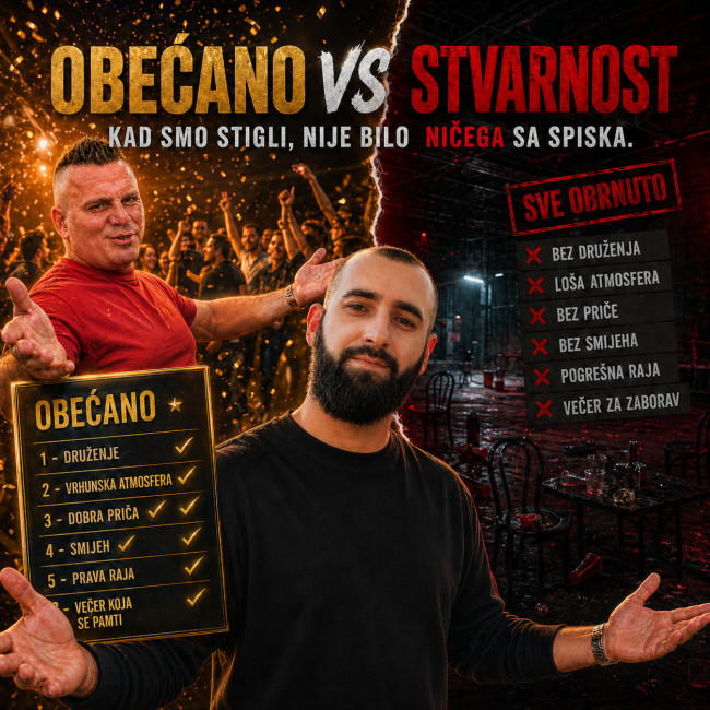 Na papiru je sve izgledalo kao događaj godine: druženje, vrhunska atmosfera, dobra priča, smijeh, prava raja i večer za pamćenje. U stvarnosti, kad smo stigli, dočekala nas je potpuno druga dimenzija — bez atmosfere, bez energije, bez onoga što je bilo najavljeno.