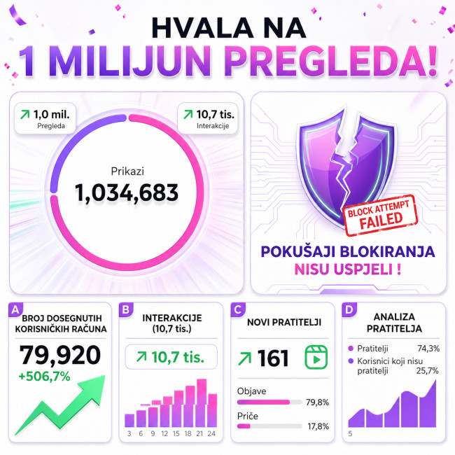 Ove brojke nisu samo statistika; one su dokaz da se dosljednost, transparentna komunikacija i vaš angažman uvijek isplate. Nastavljamo dalje sa kreiranjem sadržaja, još motivisaniji. Hvala vam na povjerenju.